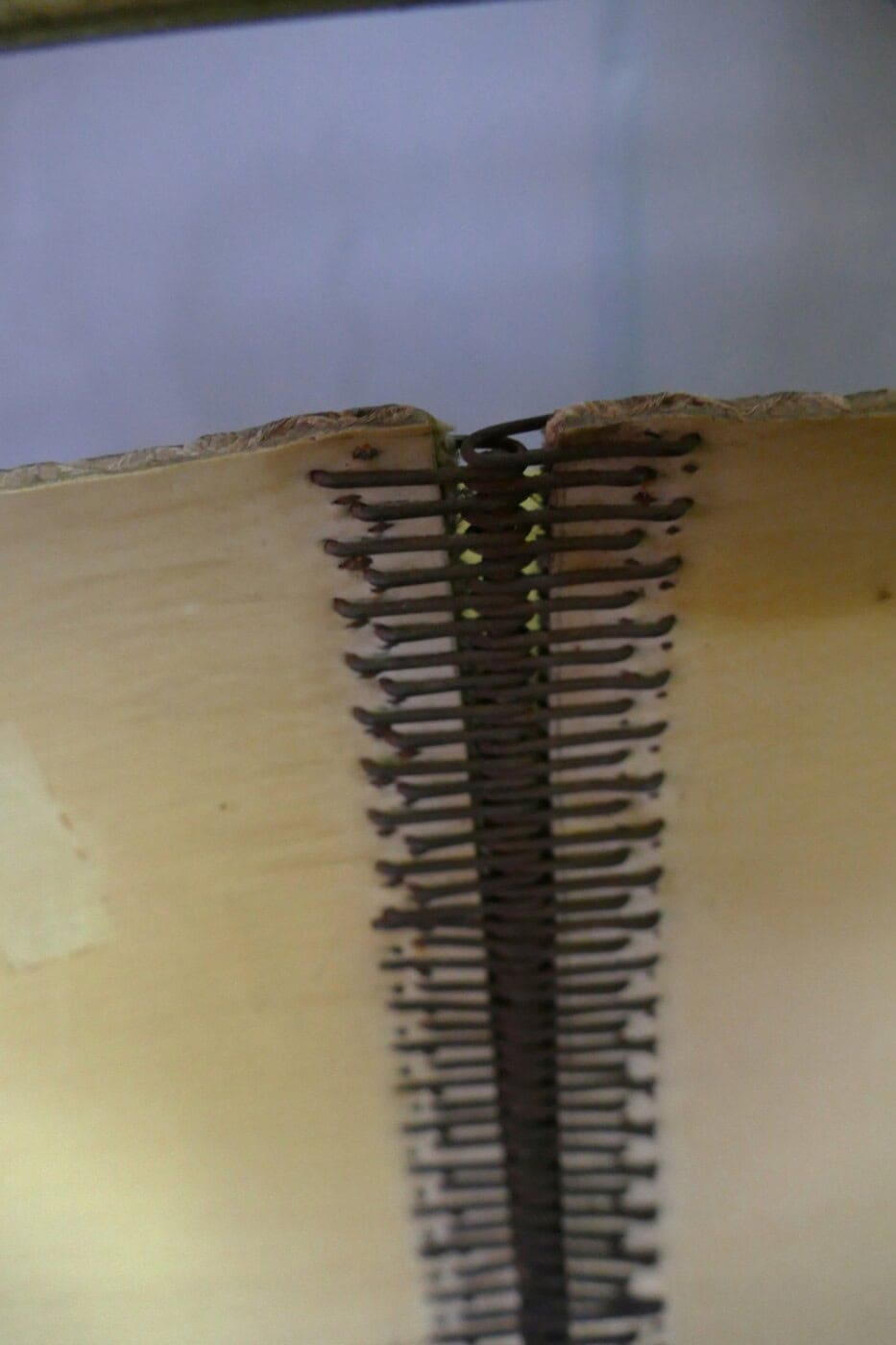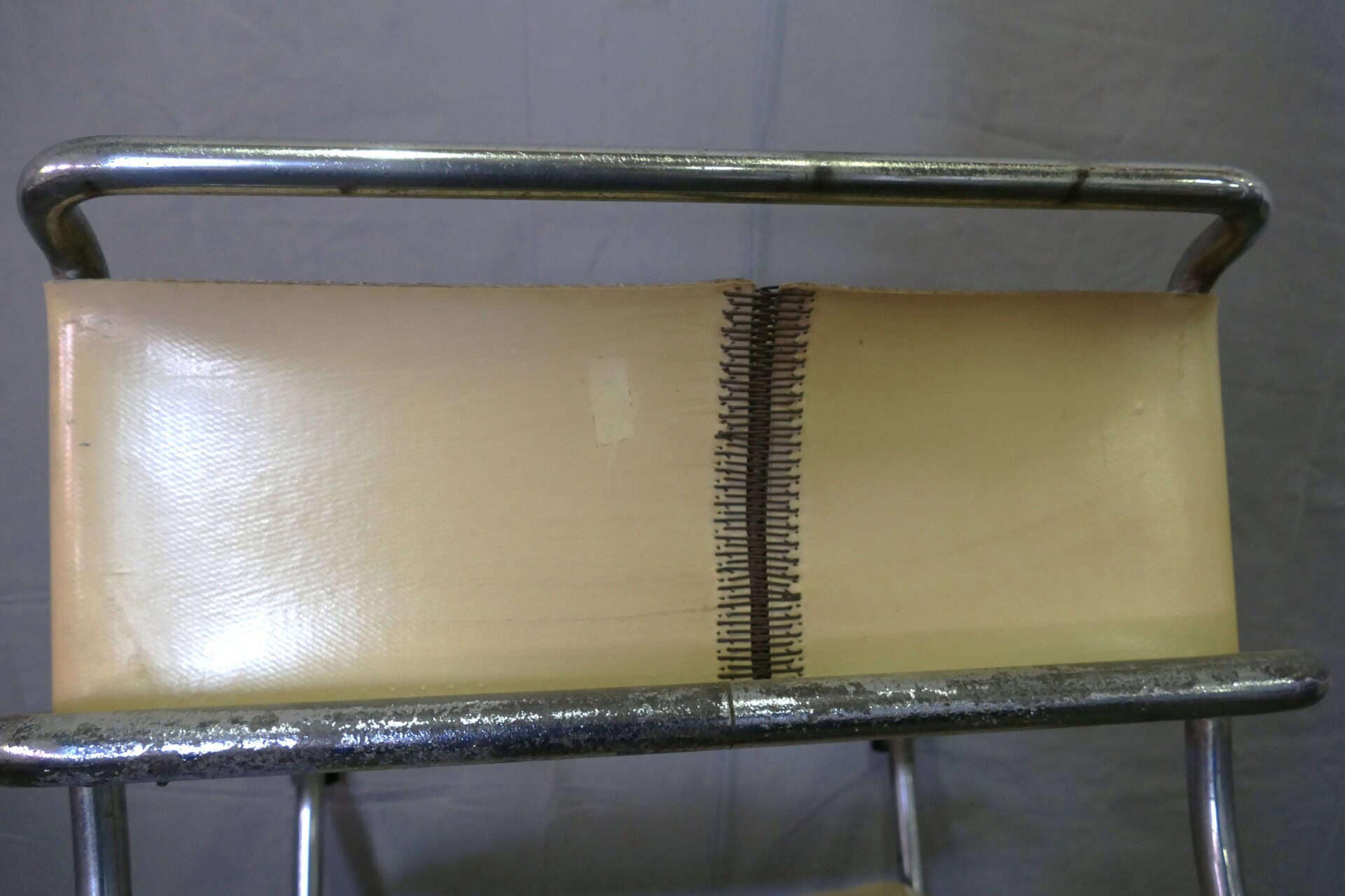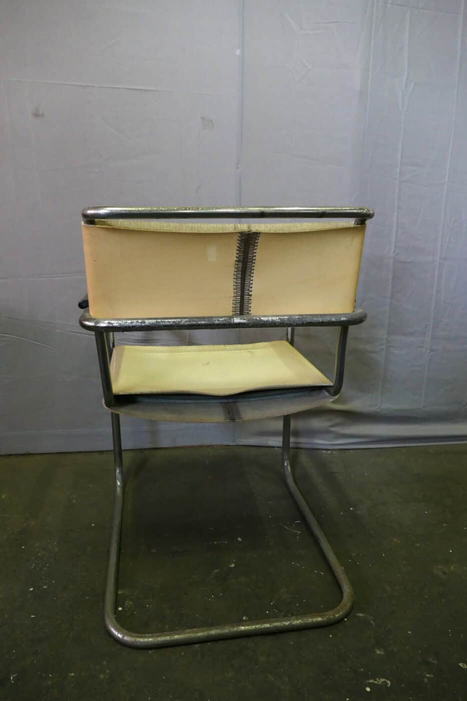 Tubular frame chair by Marcel Breuer, model B34, with distinctive upholstery. It resembles a hard floor covering attached to the frame like a loop. The connection at the rear and underside closely resembles the old-fashioned closure of a bicycle chain guard: metal loops held together by a metal rod.