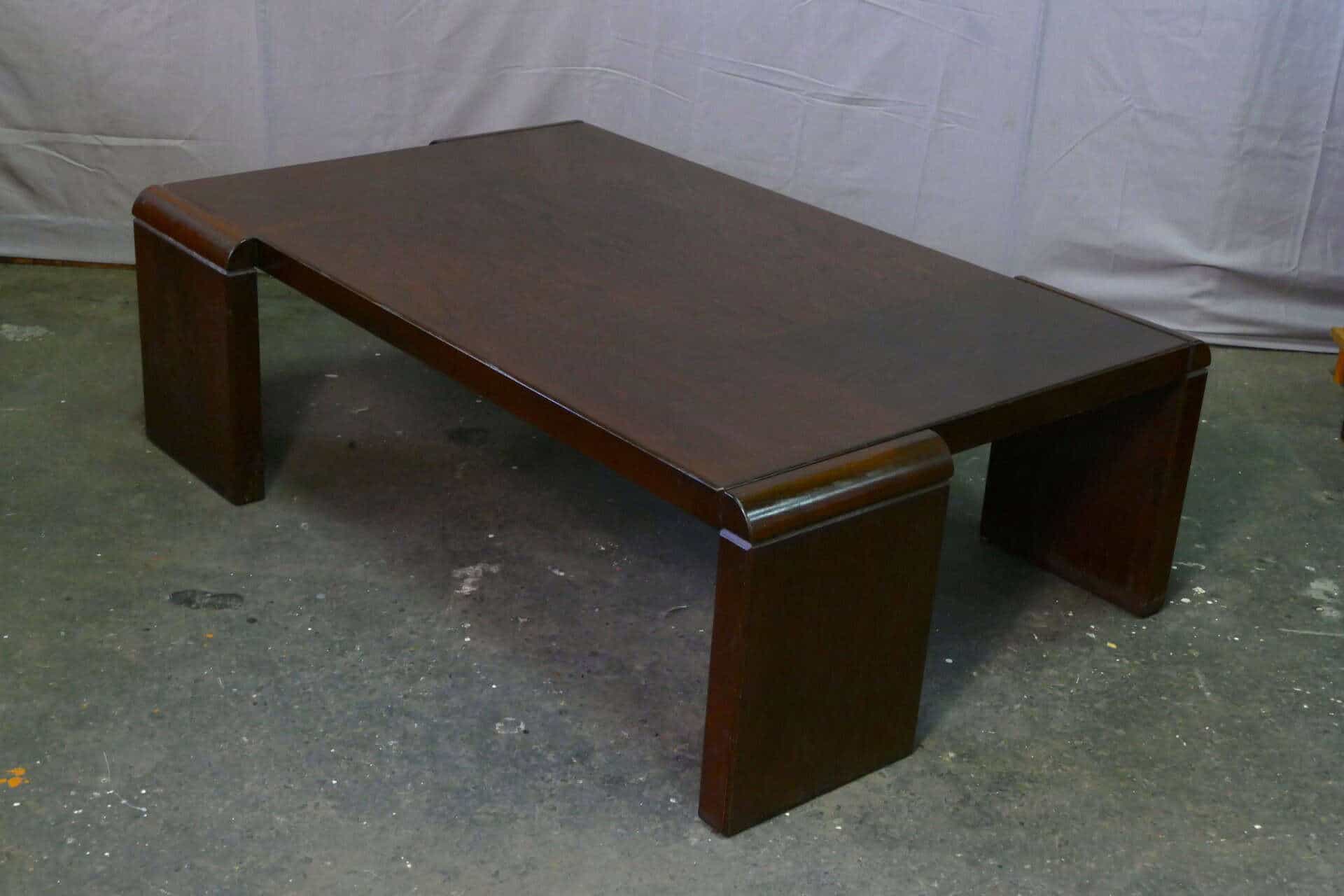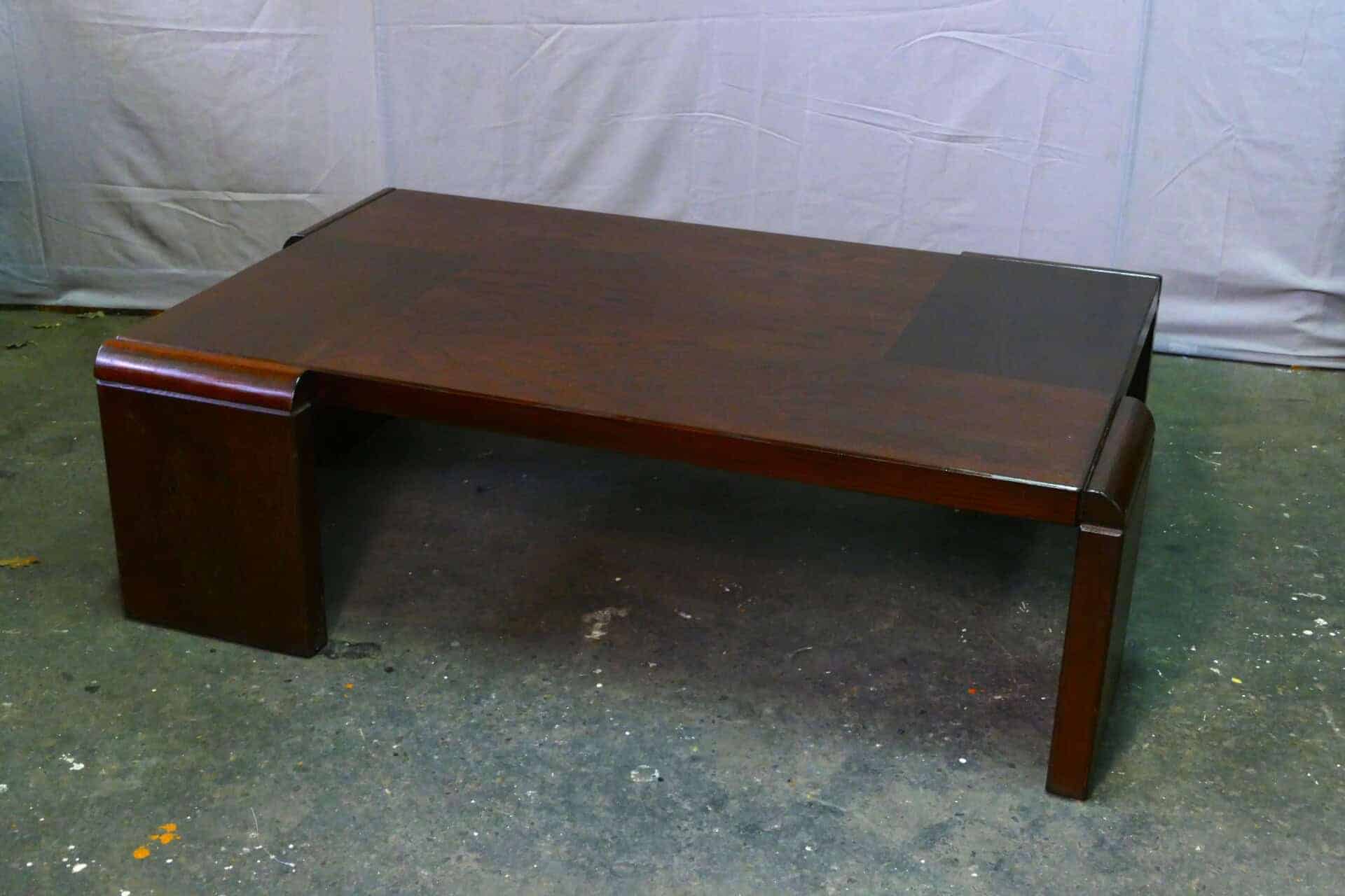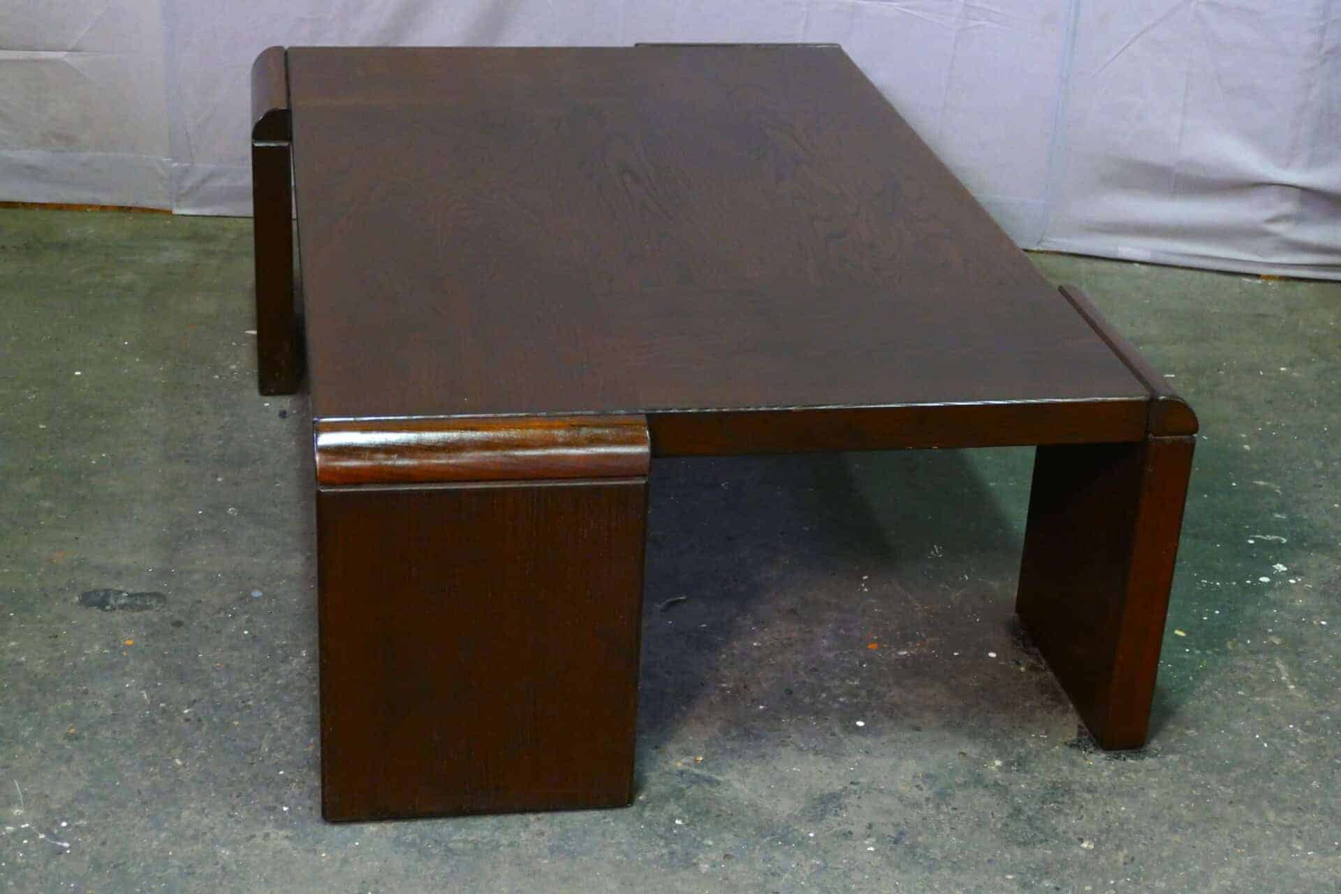 Heavy Brutalist coffee table made of dark-colored ash wood, with asymmetrically placed legs. The dark-looking strip is caused by the direction in which the veneer is applied.