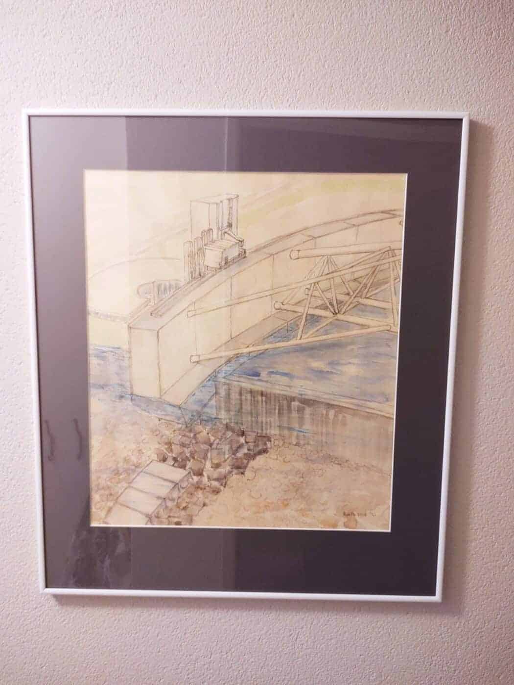 Drawing/watercolor of a detail of the Maeslantkering in the Nieuwe Waterweg by H. de Muijnck. The Maeslantkering is the final element of the Delta Works. Comes with a new mat and glass. Frame dimensions: 60 x 70 cm.