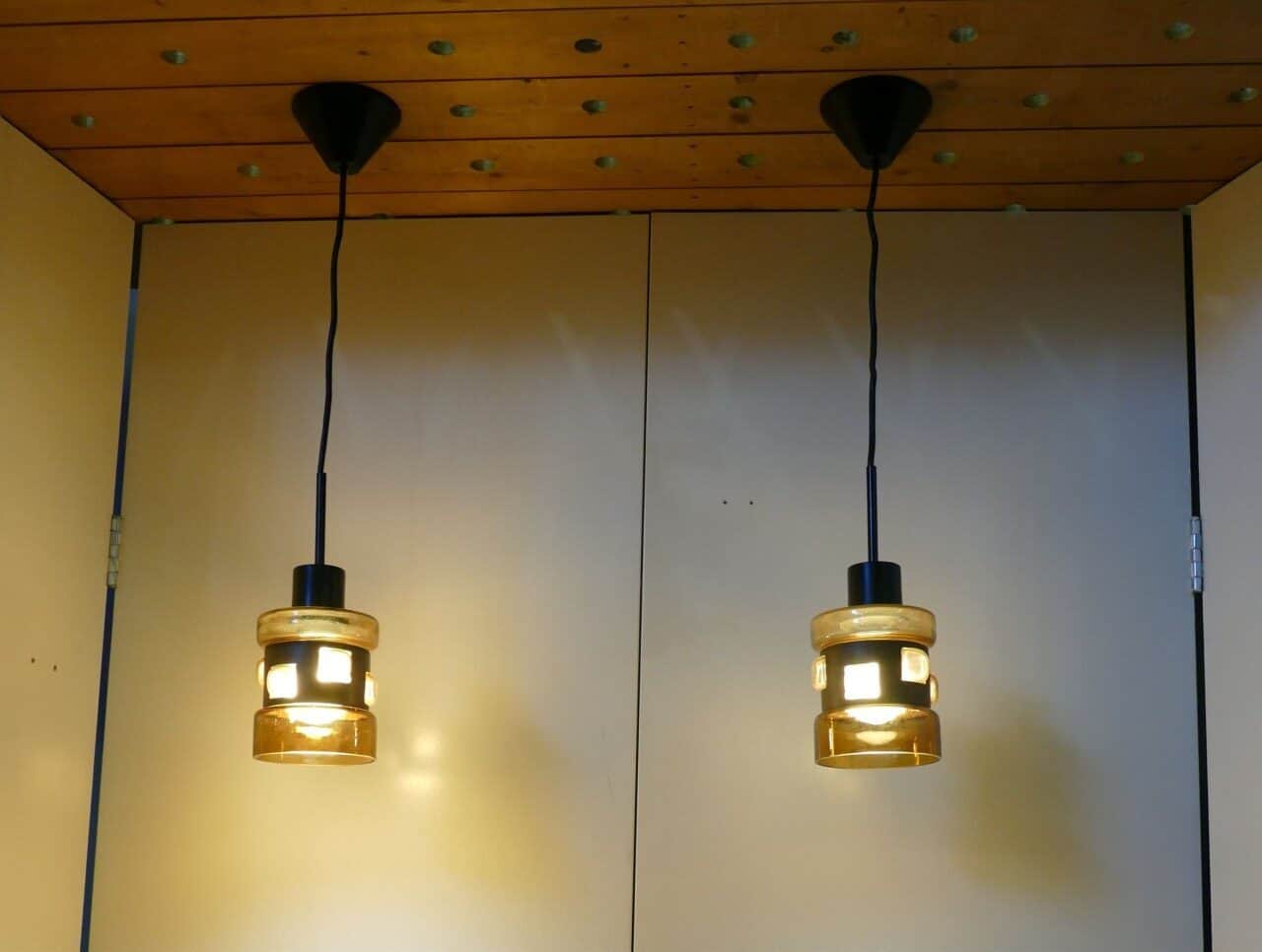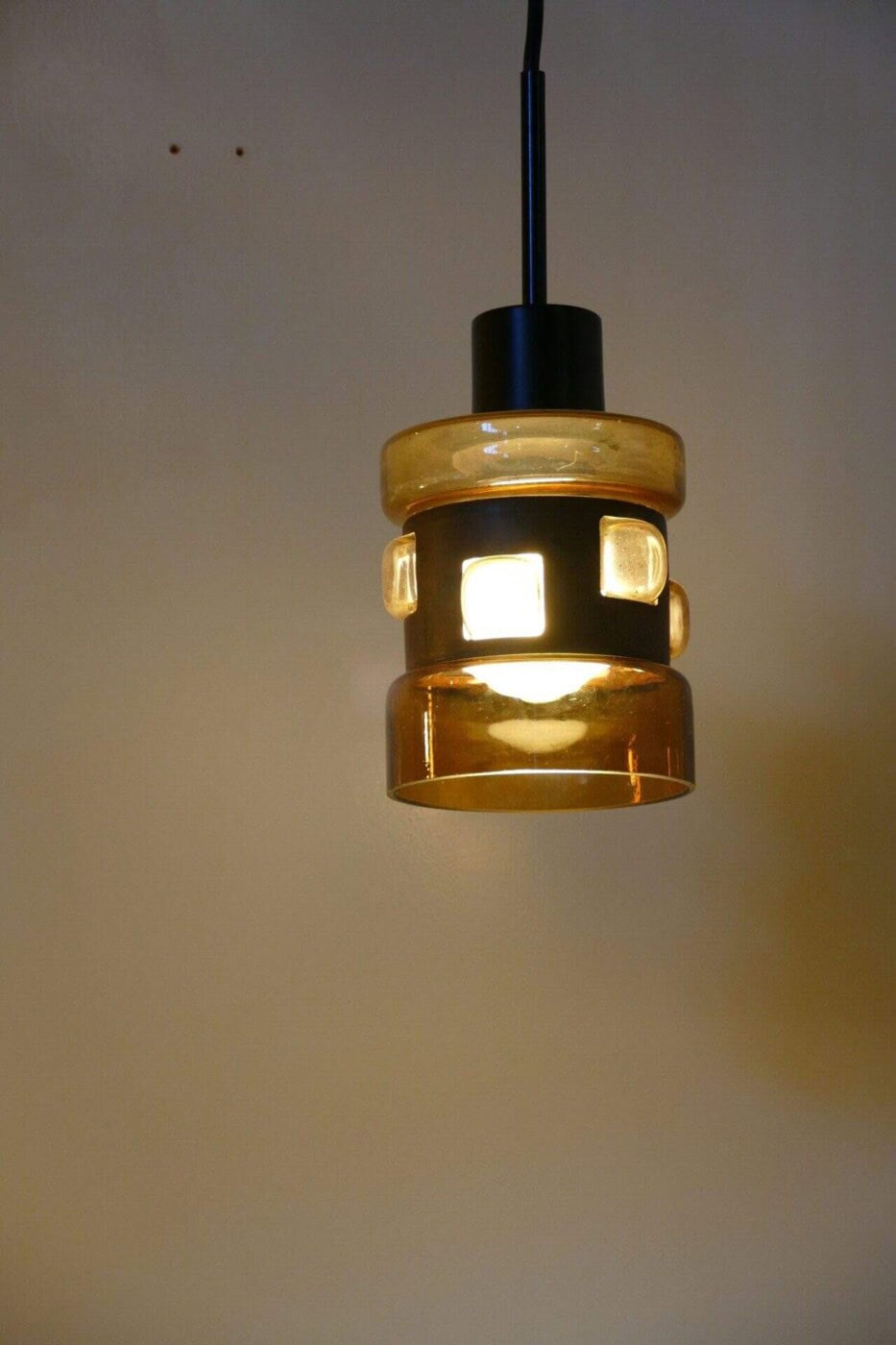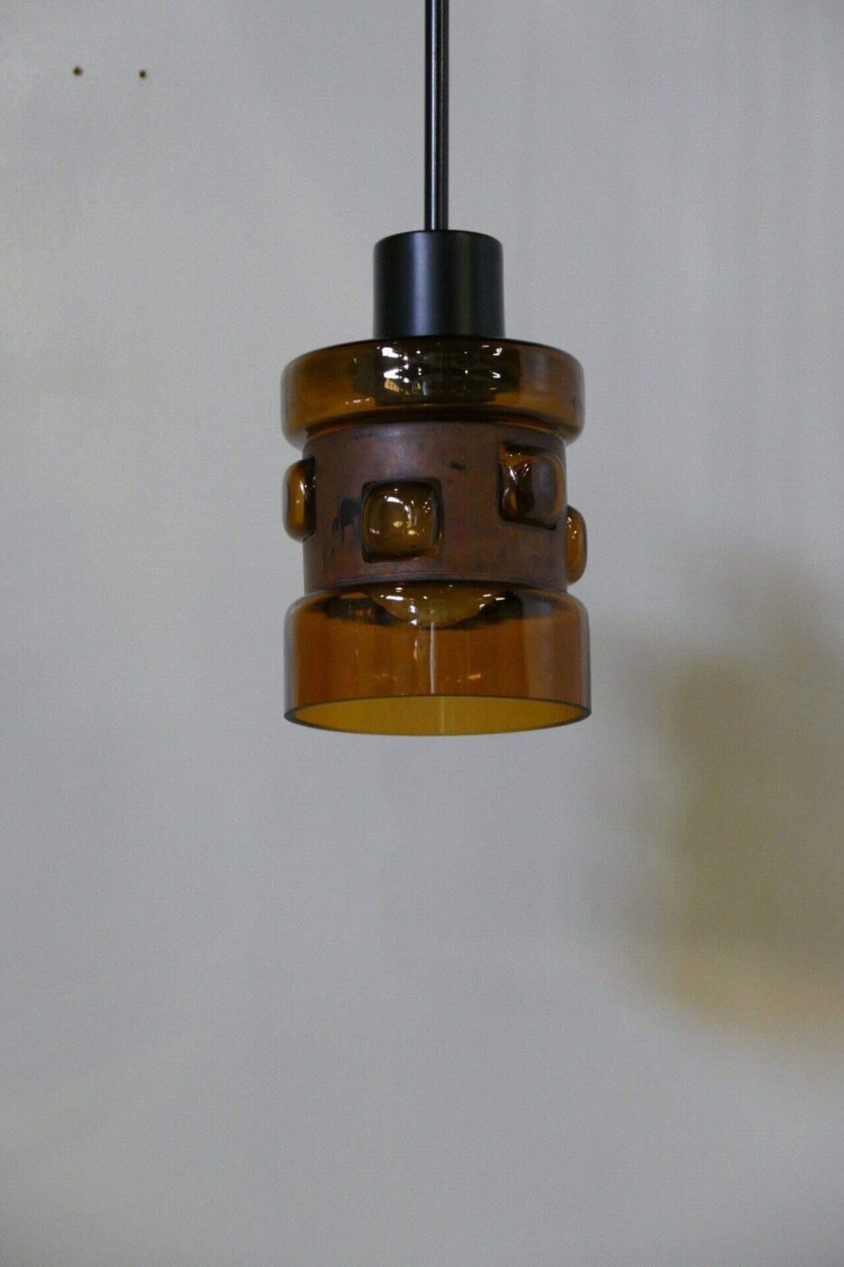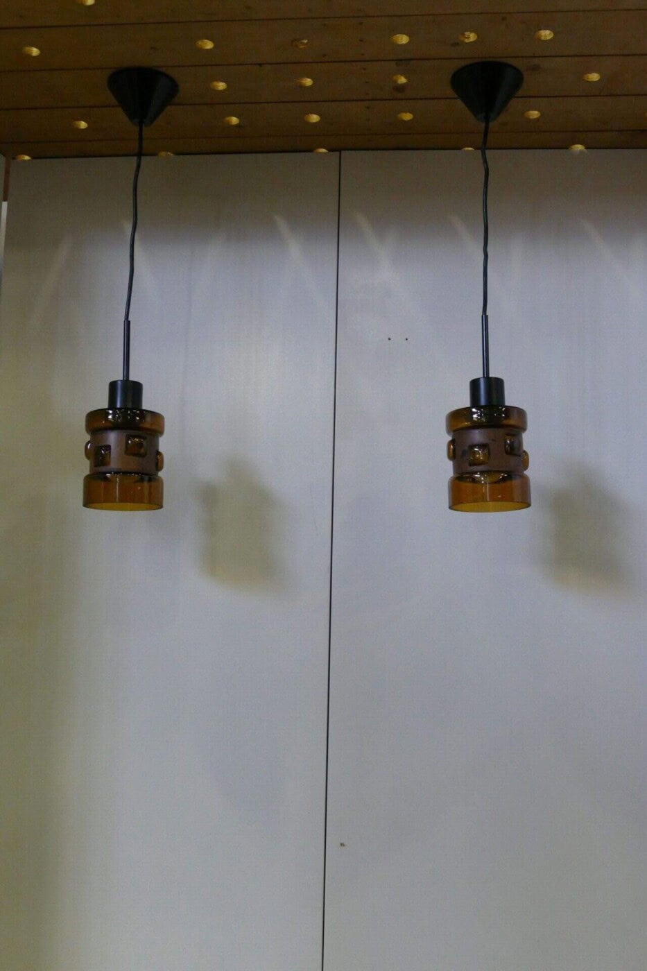 Set of two pendant lamps in dark brown glass with copper casing. Designed by Victor Bernt for Flygsfors.