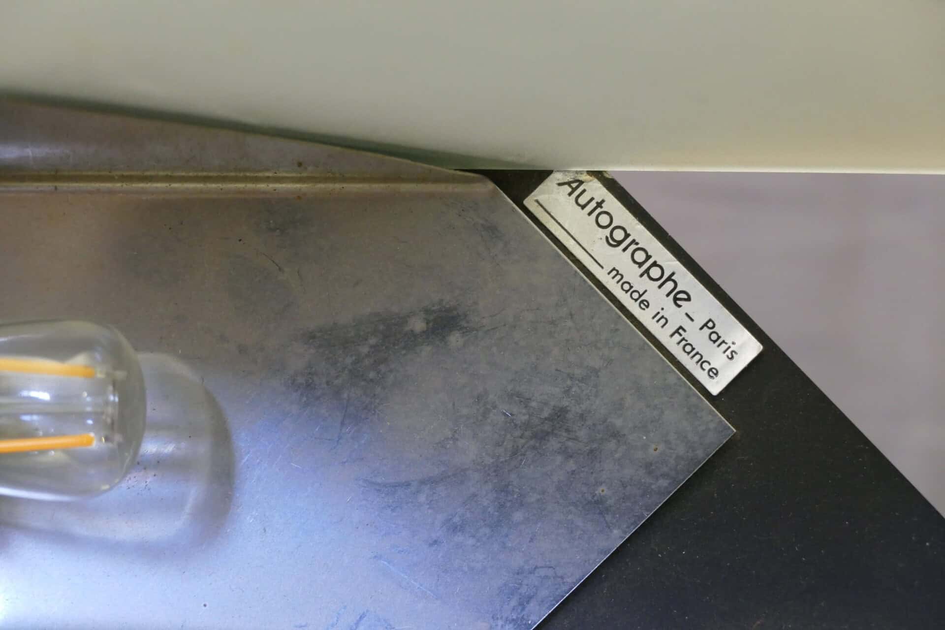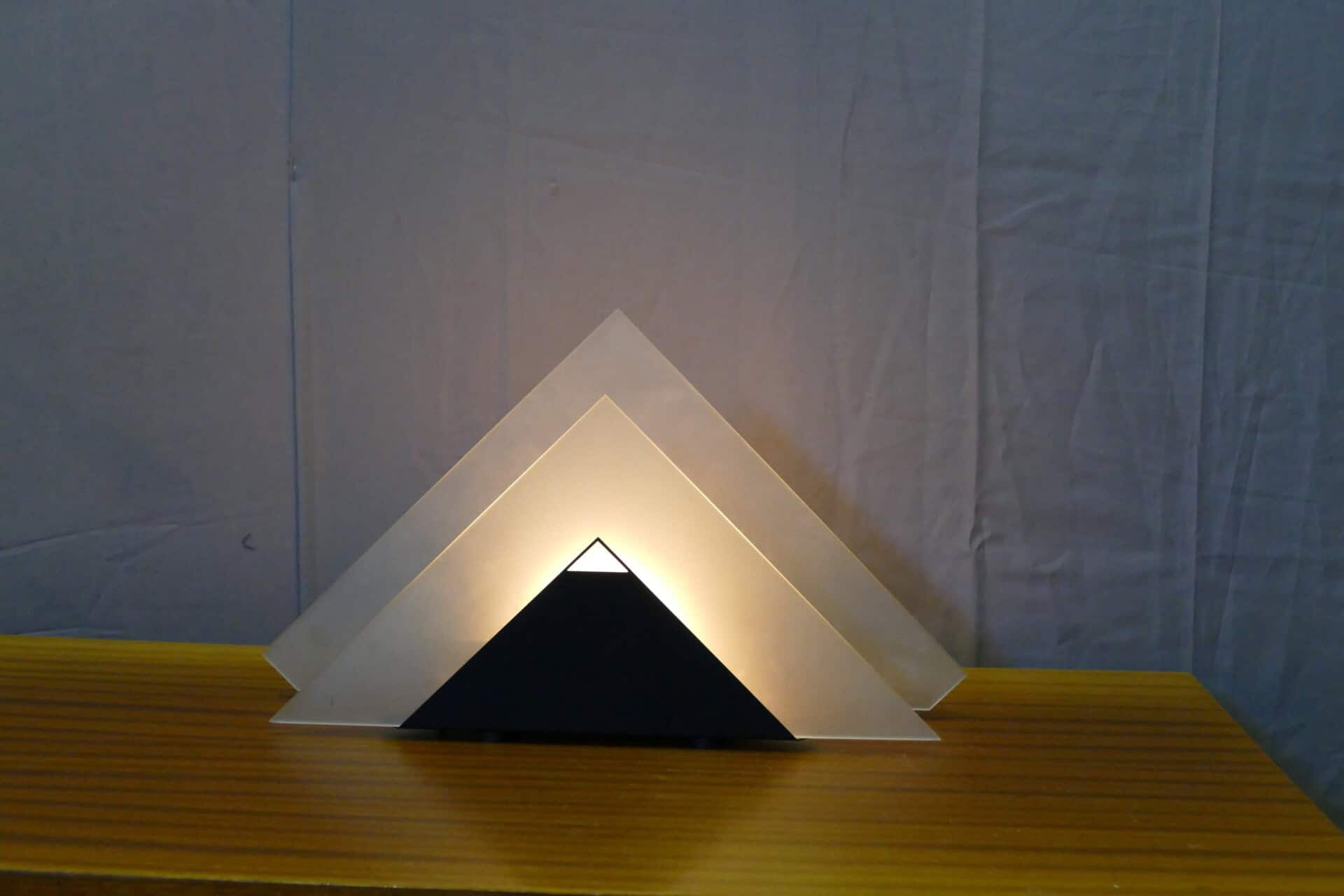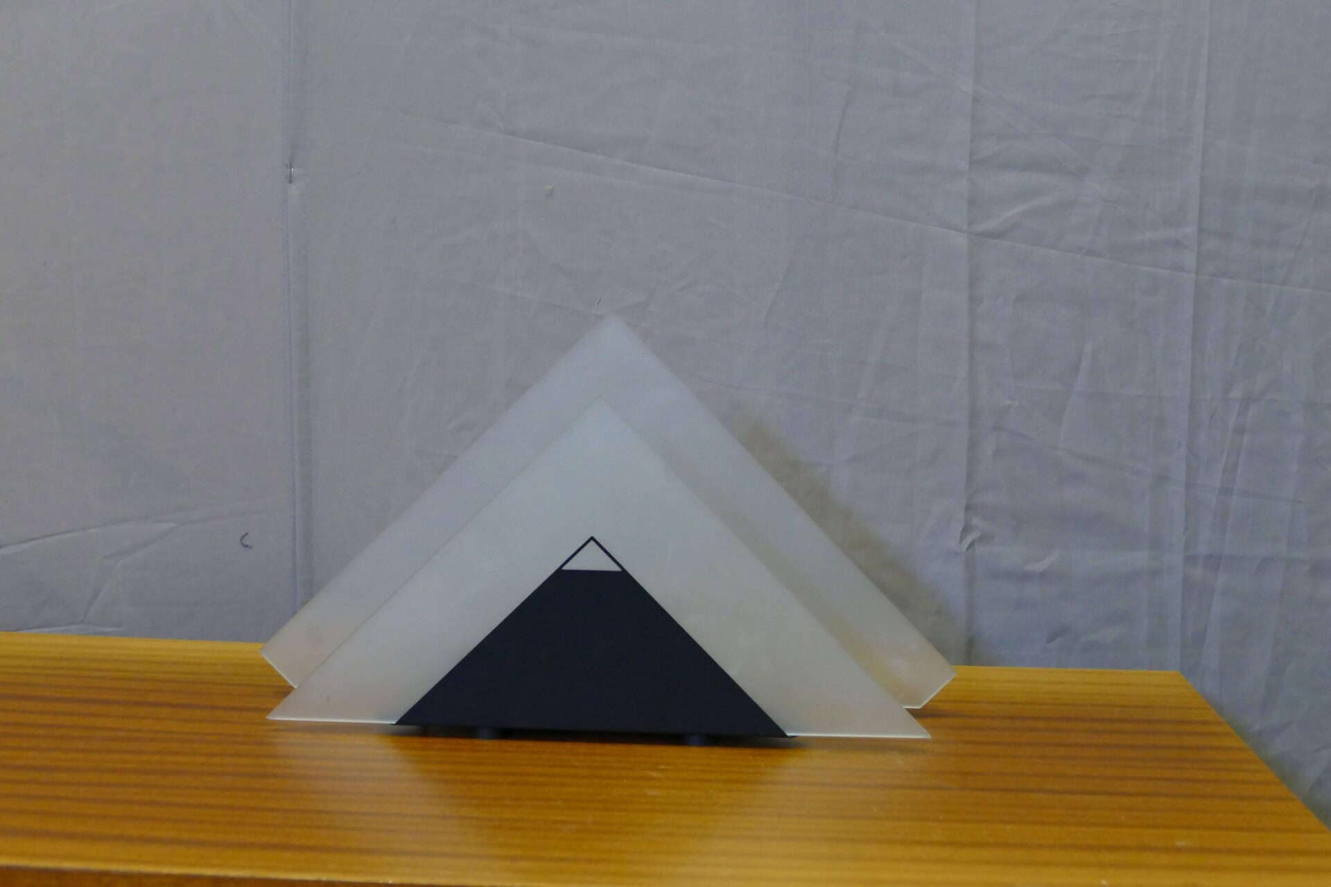 Stylish pyramid-shaped table lamp from Autographe Paris. It consists of two triangular frosted glass panels placed one behind the other in a black metal frame.