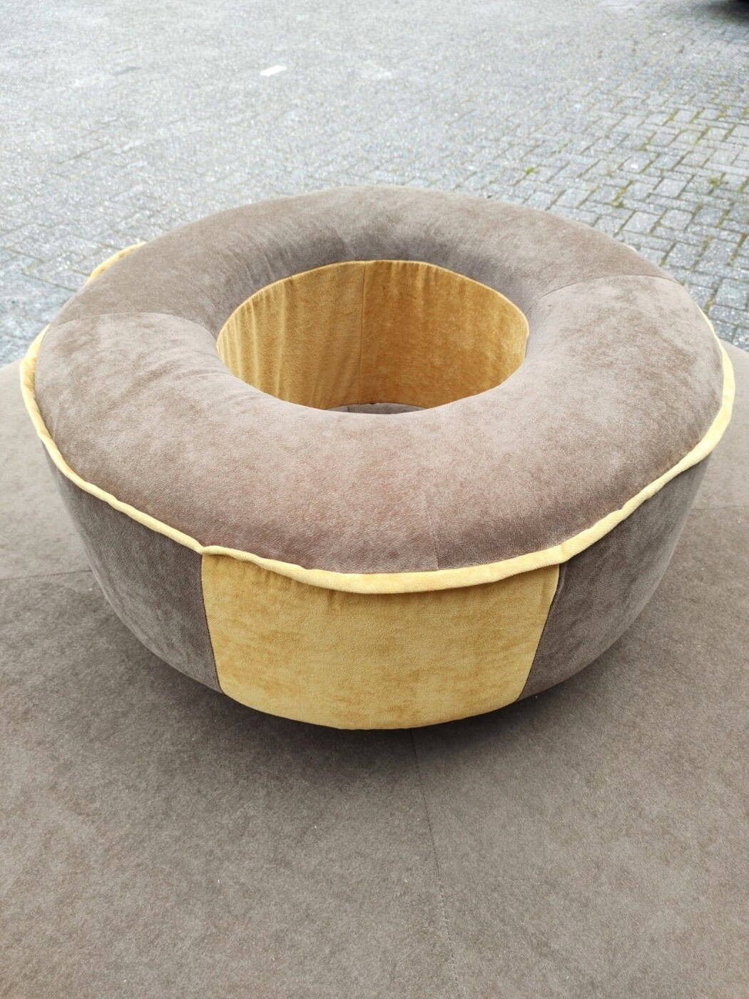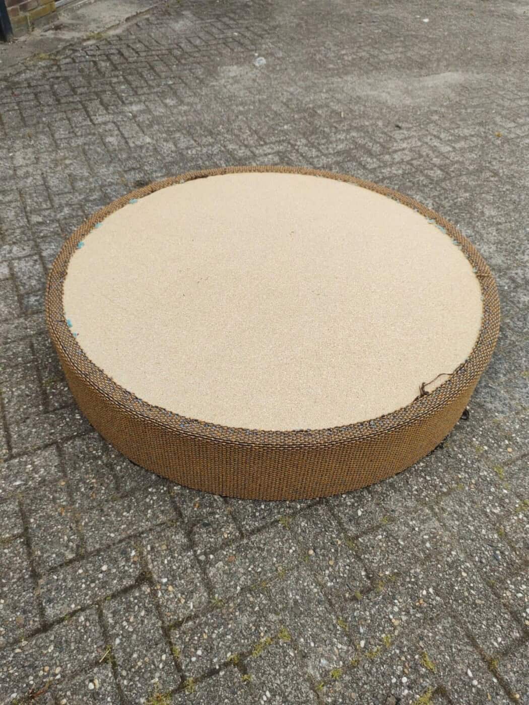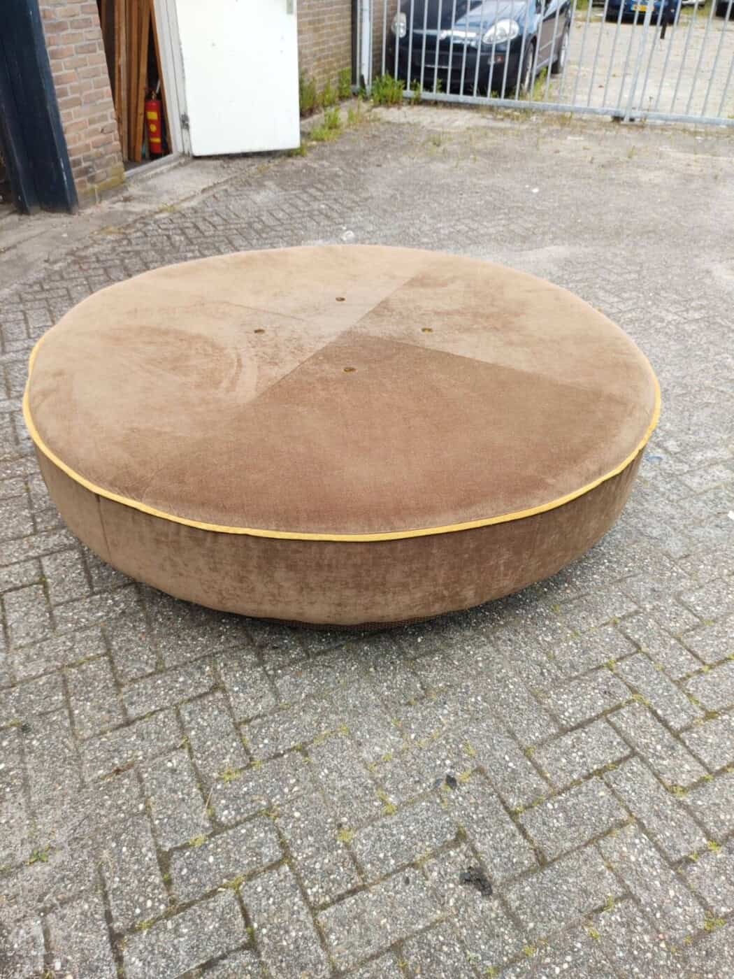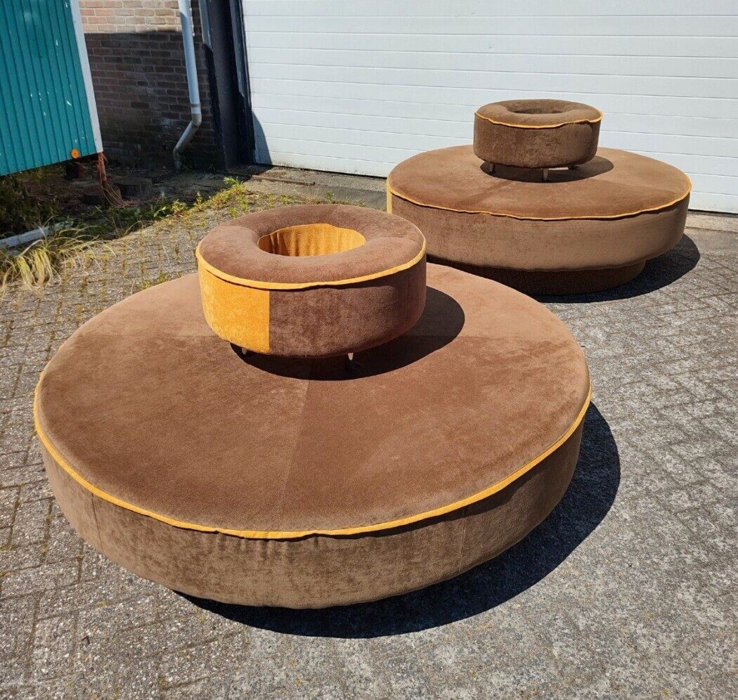 Round benches for a waiting area, gallery, lobby, shop… the possibilities are limitless! €150 each. Made up of a carpeted plinth, velor-covered seat cushion and above that the round backrest, resting on 4 chrome rods. SOLD