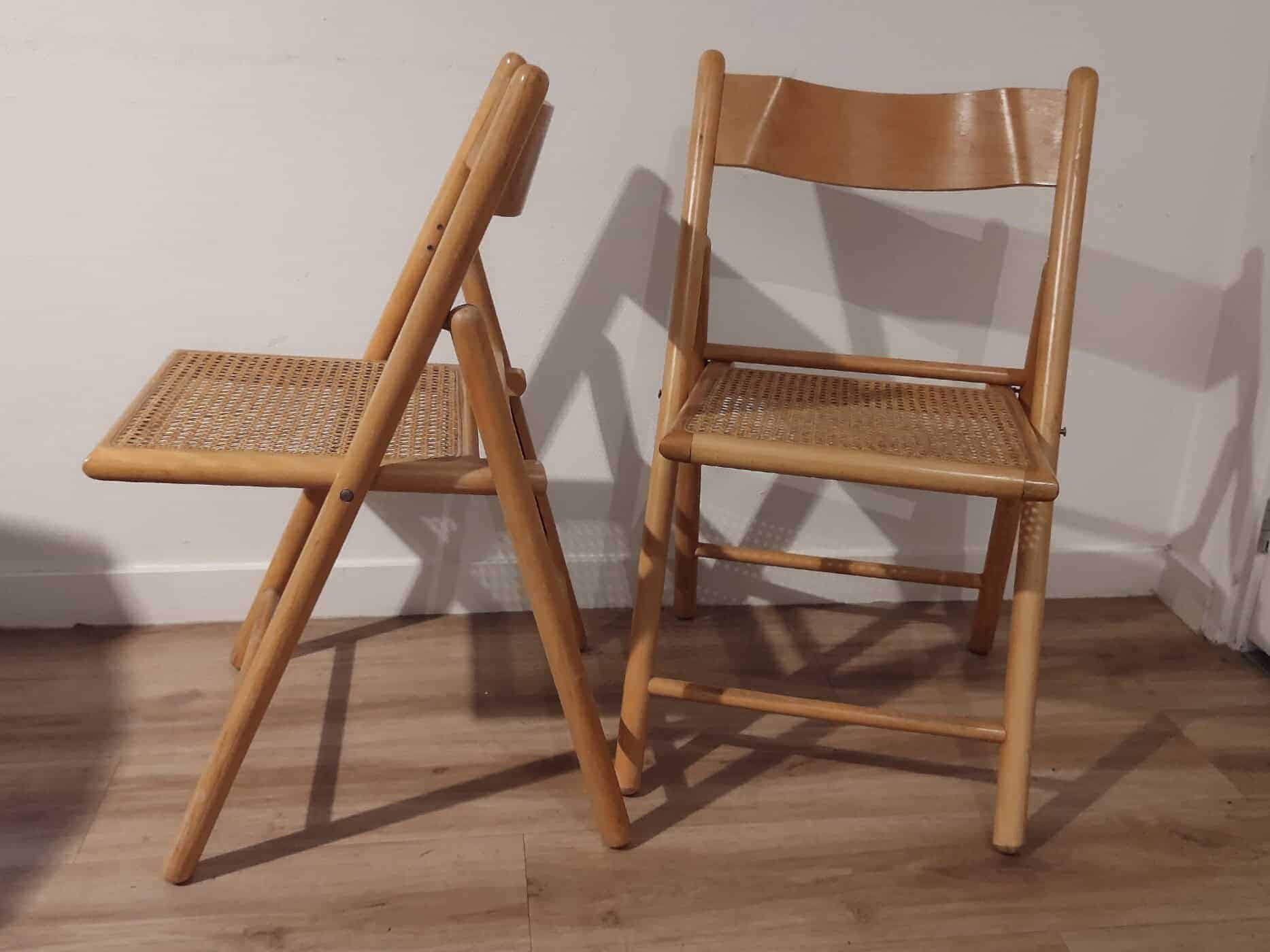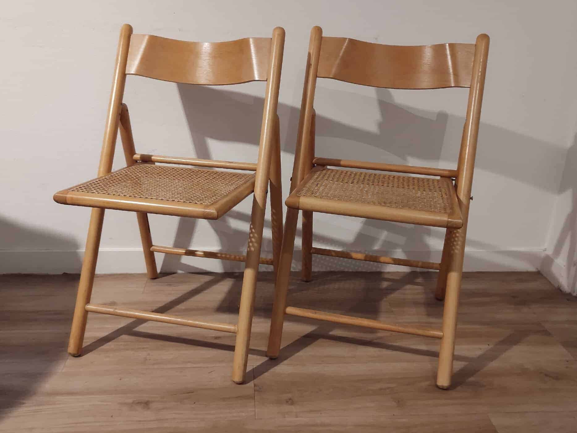 Set of two beech folding chairs with a wicker seat and curved plywood backrest. In good condition.