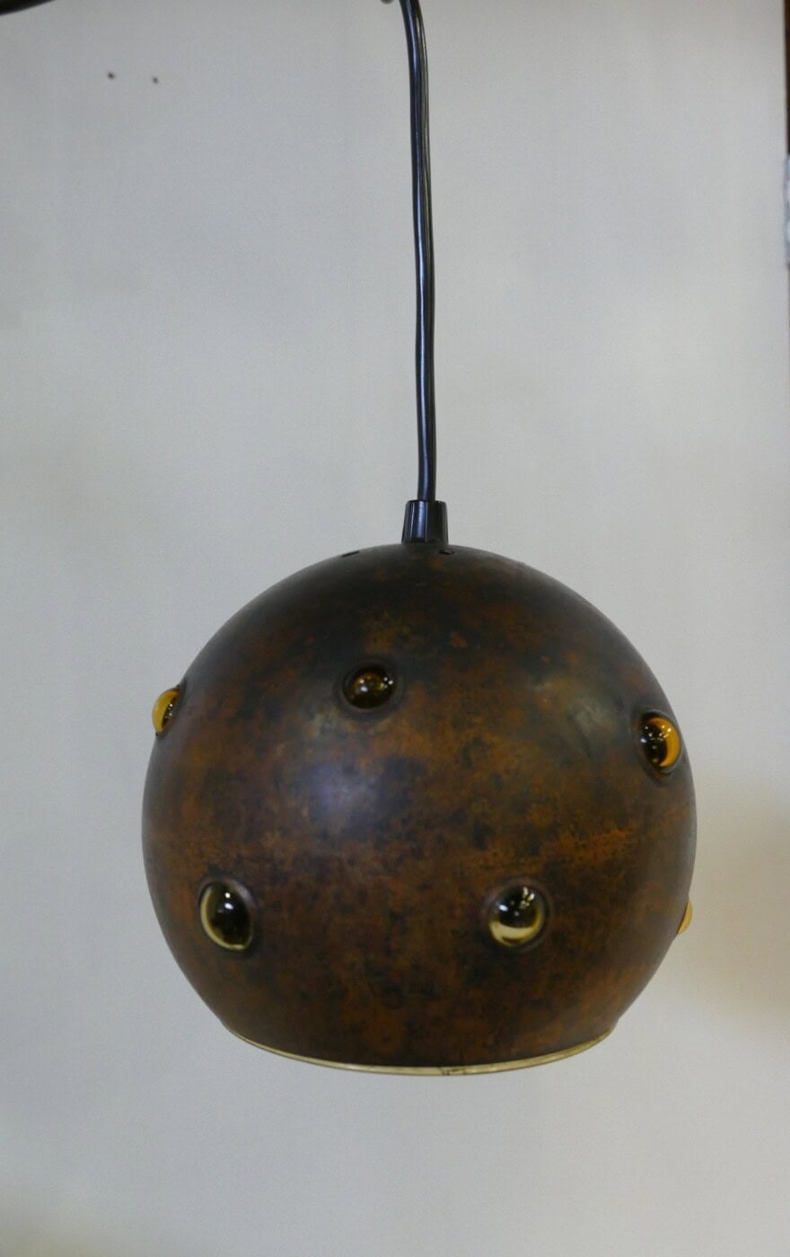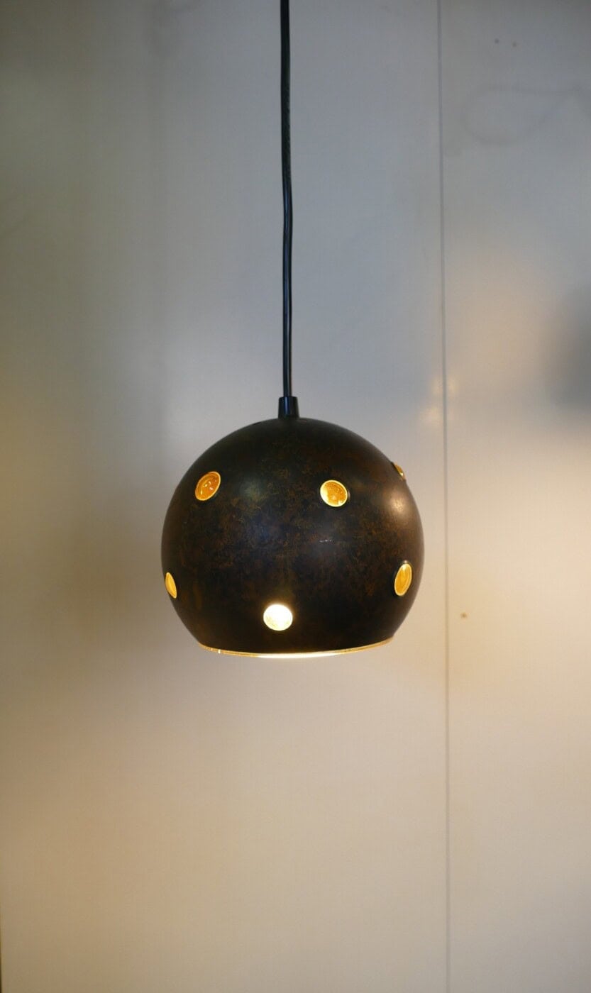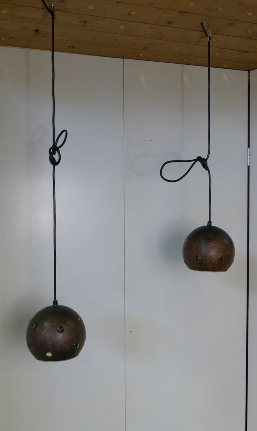 Set of two pendant lamps by Peill & Putzler. The yellow glass interior peeks out through openings in the burned copper casing, creating a unique light distribution.