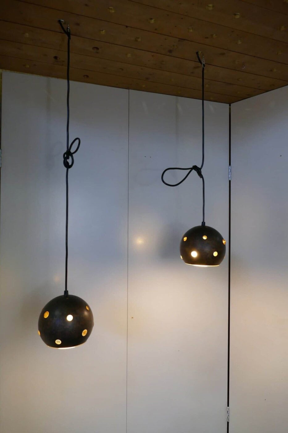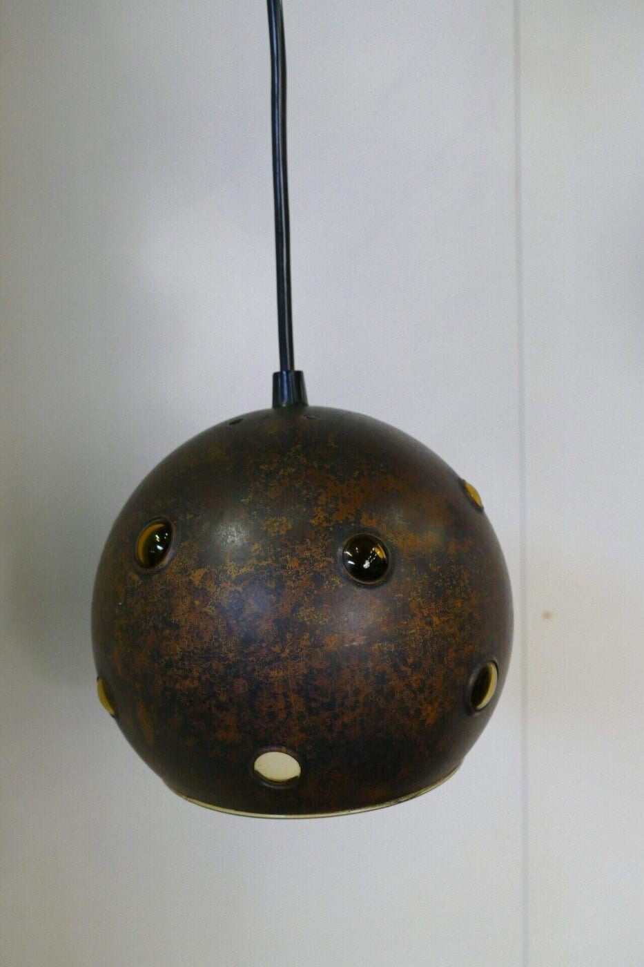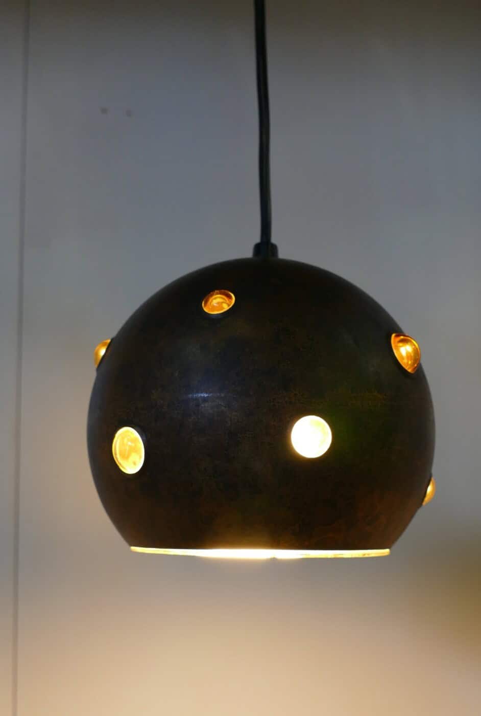Set of two pendant lamps by Peill & Putzler. The yellow glass interior peeks out through openings in the burned copper casing, creating a unique light distribution.