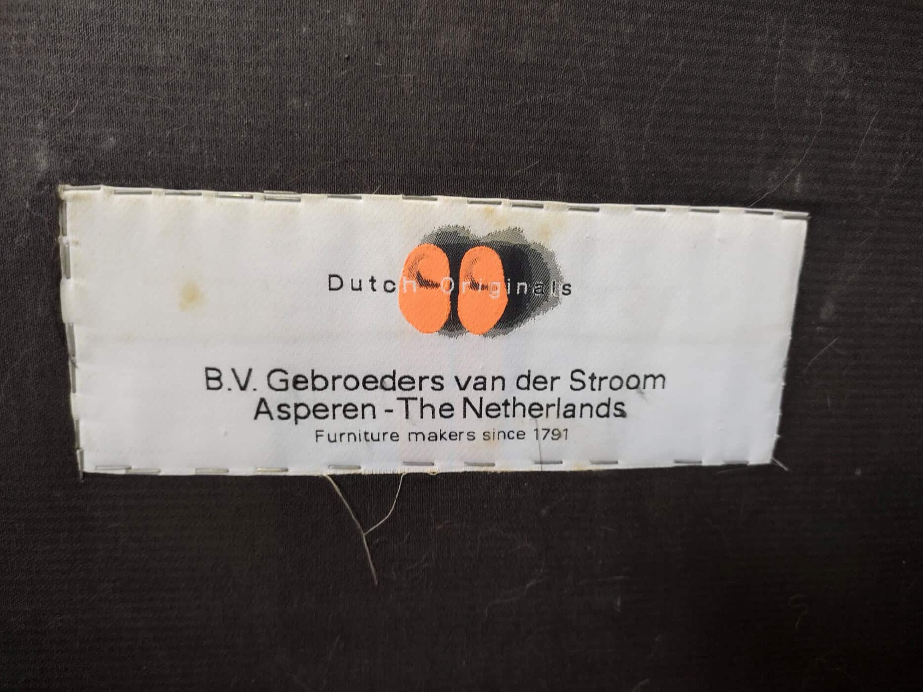 A unique sofa, designed by Harrie Staarink and produced by Gebr. Van der Stroom, labeled Dutch Originals. Recently reupholstered and fitted with new padding. The armrests are adjustable, and can be moved further toward the center after disassembly and reassembly.