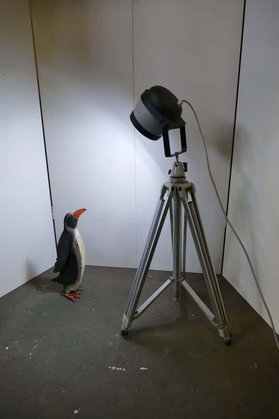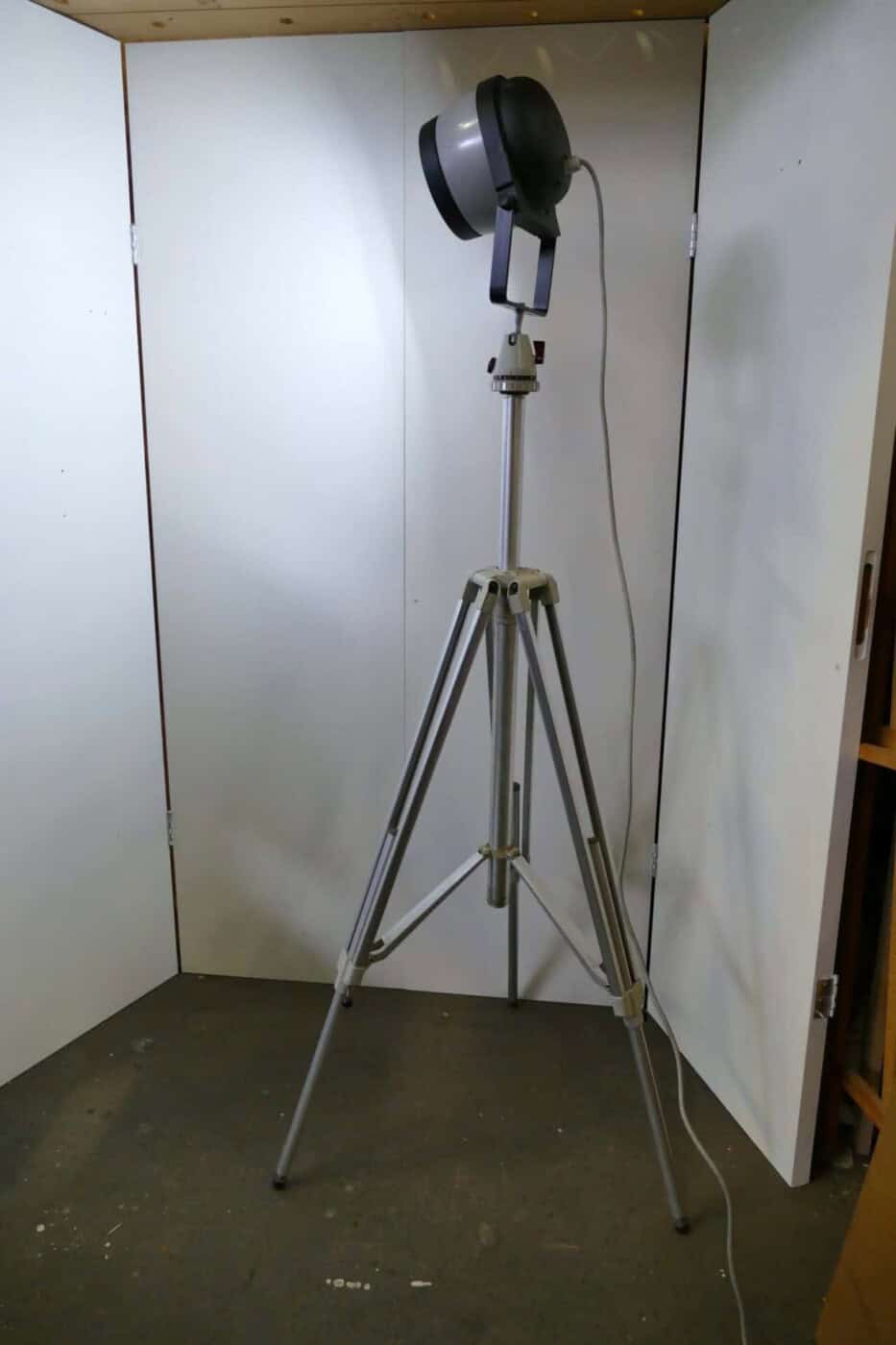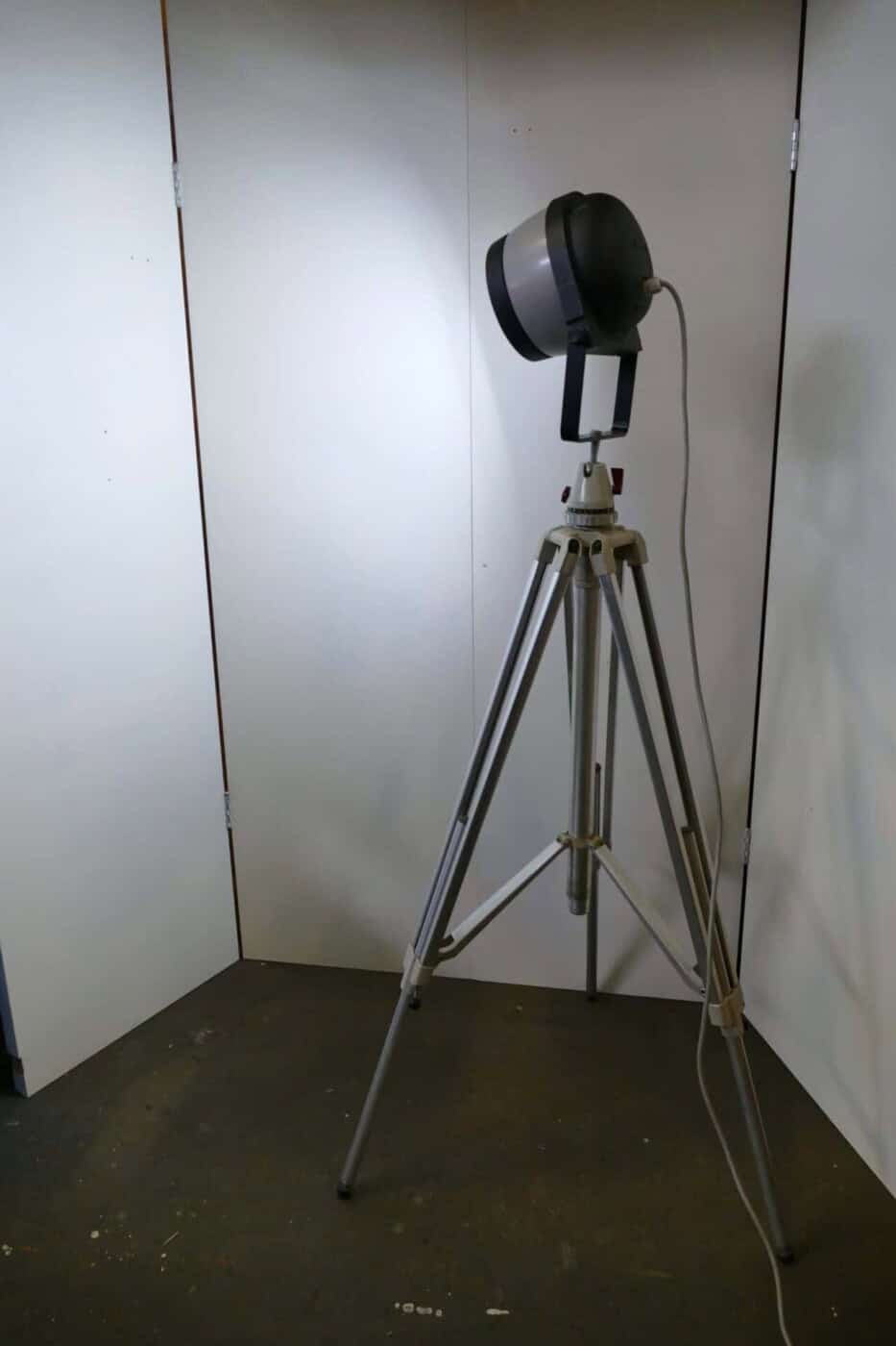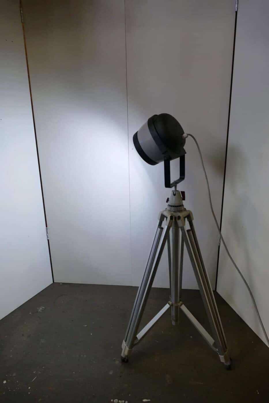 Spotlight mounted on a vintage Linhof tripod. The height can be adjusted from approximately 1 meter to approximately 2.20 meters. It is equipped with an LED bulb in an R7S socket.