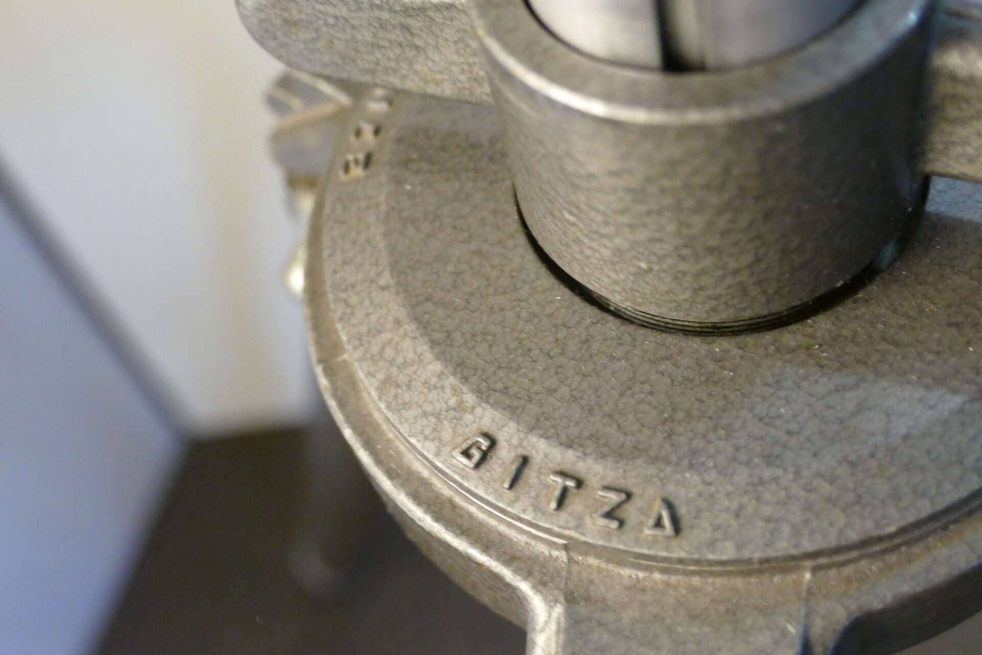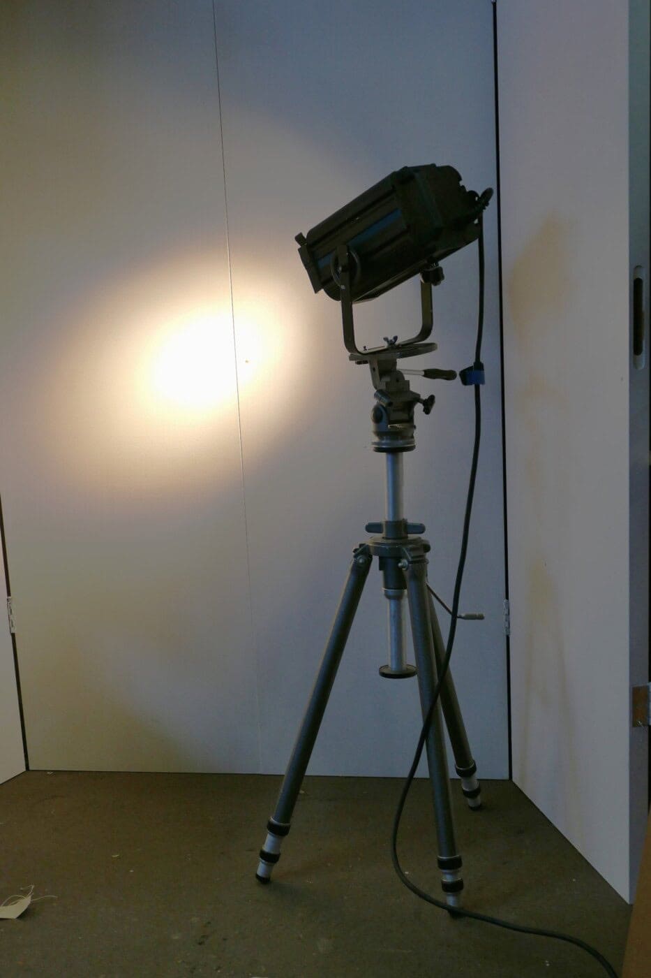 Original theater spotlight equipped with LED PAR lamp on Gitzo tripod, height varying from 1.20 to over 2.50 high.