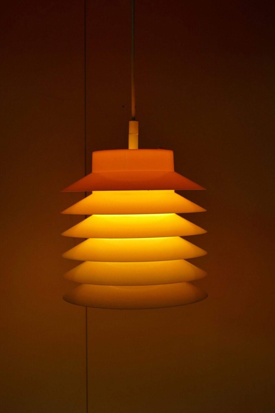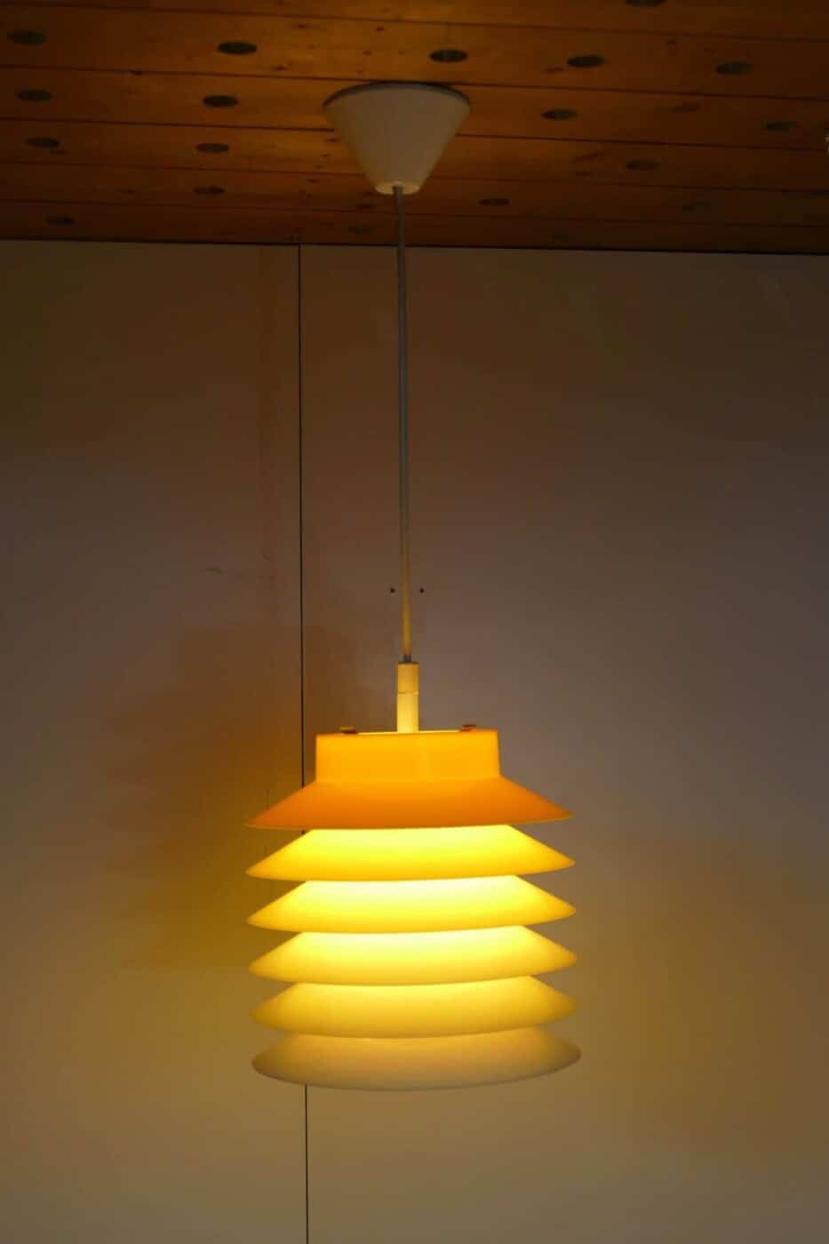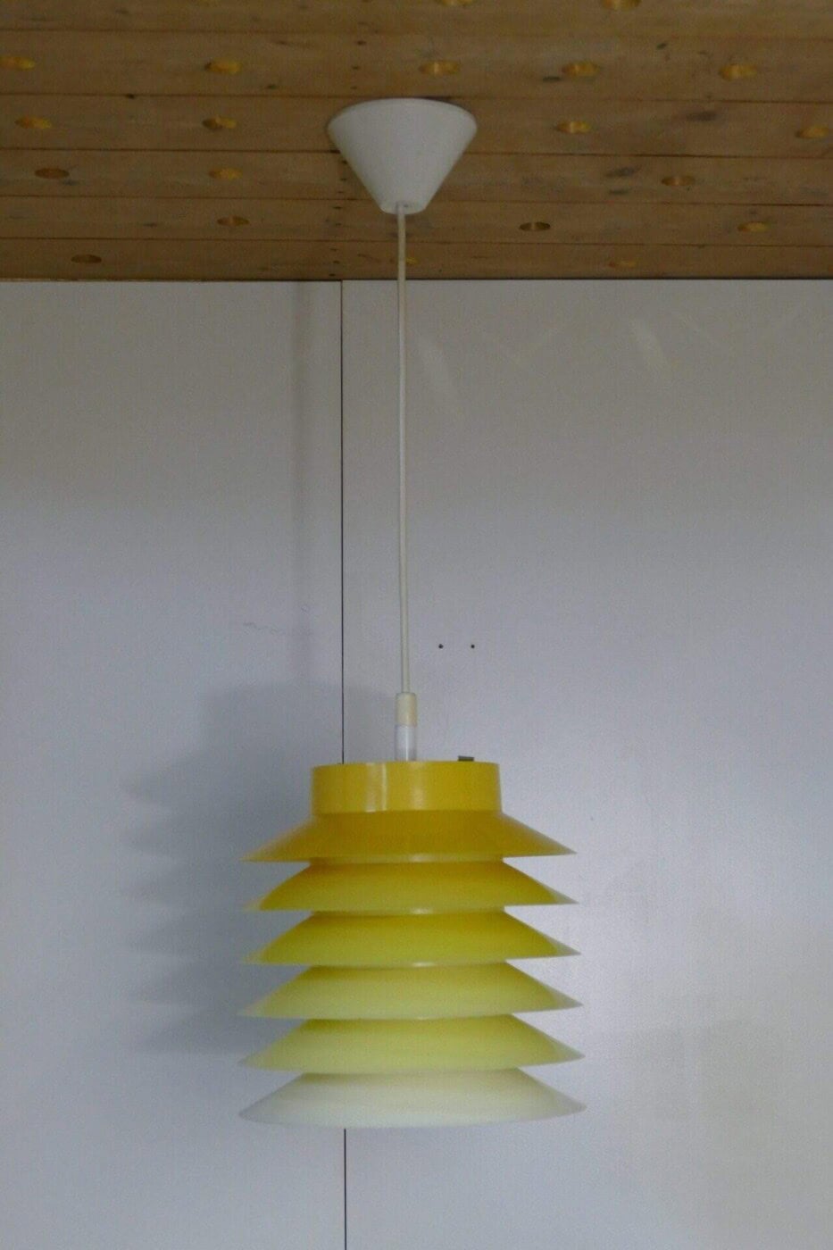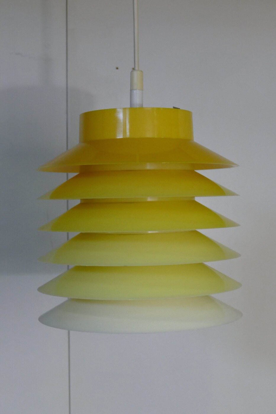 Vintage plastic pendant lamp in shades of yellow. Danish design, brand unknown. Diameter and height o 23 cm. With original ceiling cap.